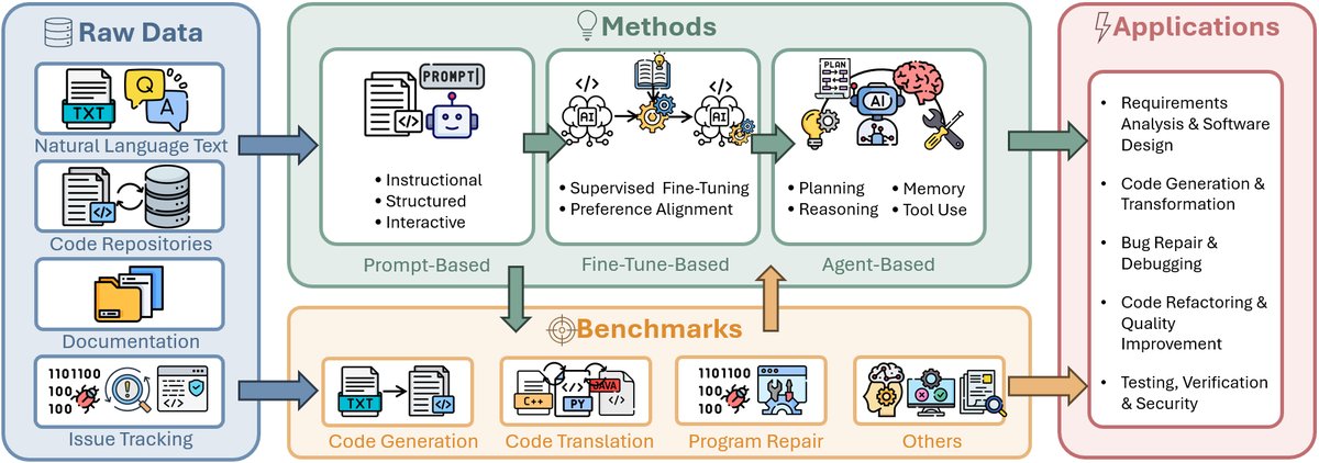 软件工程 (Software Engineering) 旨在通过系统化的方法、工具和实践,开发高质量、可靠且可维护的软件系统。传统方法如基于规则和模板的系统,在应对复杂编程场景时显得力不从心。近年来,研究重心已转向基于学习的方法,特别是大型语言模型 (Large Language Models, LLMs)。