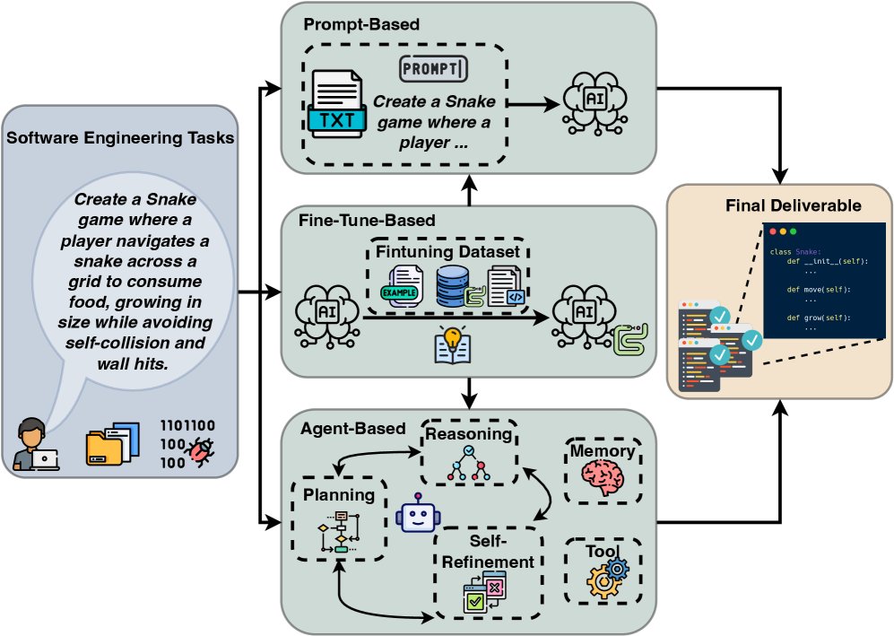 LLM的出现从根本上改变了软件工程的面貌。如下图所示,现代基于LLM的软件工程流程始于多样化的软件工程任务,采用三种主要方法框架:
