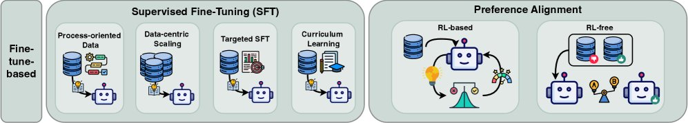 - 基于微调的解决方案 (Fine-Tune-Based Solutions):通过监督微调 (SFT) 或基于强化学习 (RL)/无RL的偏好对齐来提升模型性能。