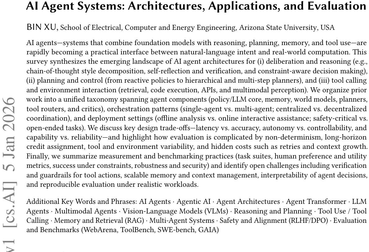 这篇发表于 JACM 2025 的综述论文《AI Agent Systems: Architectures, Applications, and Evaluation》给出了答案。该研究由亚利桑那州立大学等机构完成,它不仅系统梳理了 AI智能体(AI Agents)的架构全景,更提出了一个统一的 Agent Transformer 抽象范式,为理解从“聊天机器人”到“自主智能体”的进化提供了清晰的理论框架。