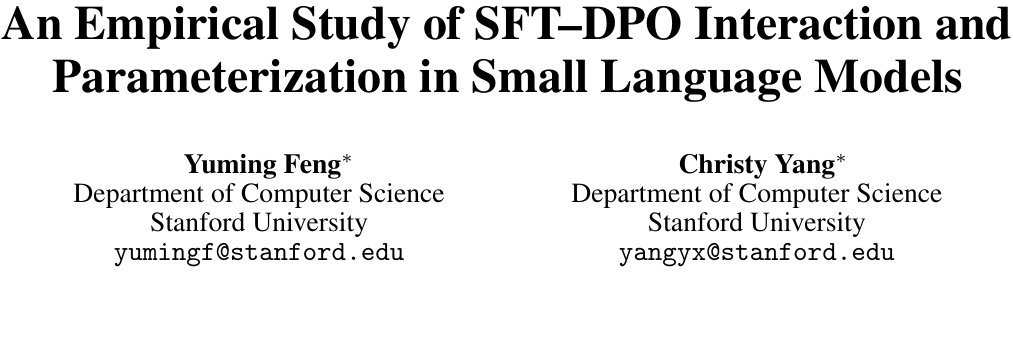 来自斯坦福大学的一项最新实证研究,就给这个“想当然”的流程画上了一个大大的问号。研究者们在GPT-2(1.24亿参数)这样的小模型上系统地“解剖”了SFT、DPO、全量微调和LoRA的相互作用。