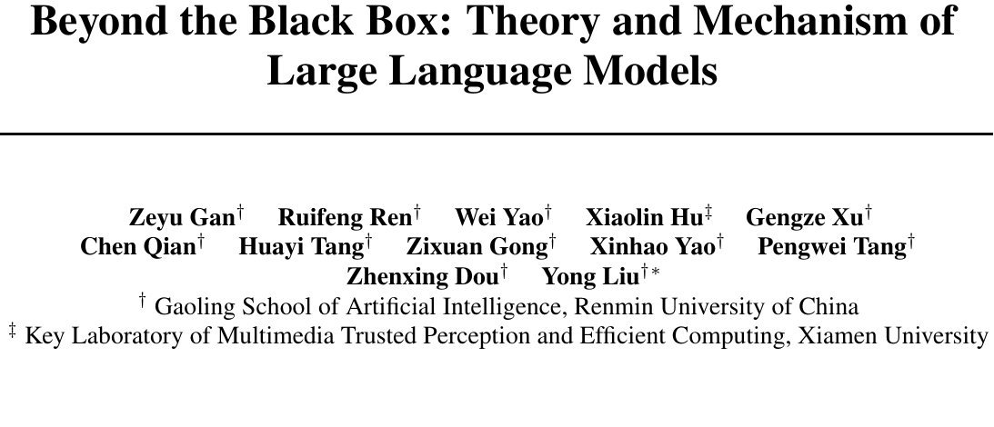 为了打破这一僵局,来自中国人民大学和厦门大学的研究团队发布了一篇重磅综述《Beyond the Black Box: Theory and Mechanism of Large Language Models》。这不仅仅是一篇文献汇总,更是一张试图将 LLM 从“工程启发”推向“严谨科学”的路线图。