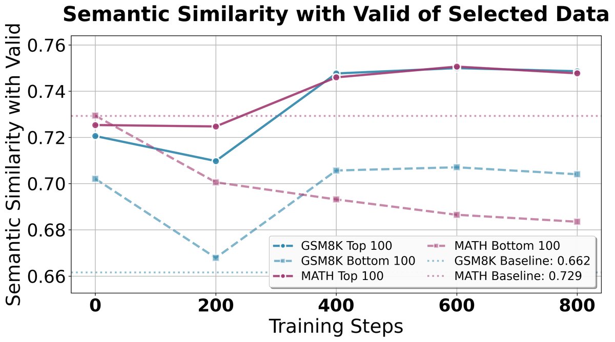 - 数据选择的语义相关性:分析表明,CROPI选出的数据在语义上与验证集更相似,说明该方法能自动识别与目标任务最相关的训练样本。