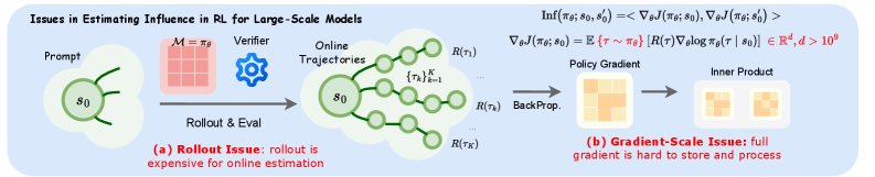 应用影响函数这一更具理论基础的方法,面临一个巨大障碍:计算影响函数需要获取策略梯度,而为LLM计算策略梯度需要进行策略“rollout”(即模型根据当前策略生成完整的解题步骤),这一过程计算成本极高,使得在线、实时地评估每个数据点的影响力变得不切实际。