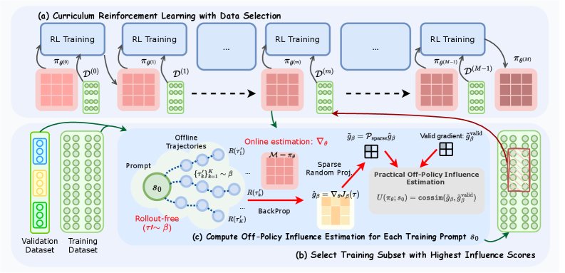 - 影响力计算:在每个阶段开始时,利用当前的策略检查点 \($\pi\_{\theta^{(m)}}\)$,通过离策略梯度估计和稀疏随机投影,计算训练集中每个数据点 \($s\_0\)$ 对于一个或多个验证集 \($\mathcal{D}\_{\text{val}}\)$ 的影响力得分。当有多个验证集时,使用倒数排序融合(Reciprocal Rank Fusion, RRF)方法整合来自不同验证集的分数。