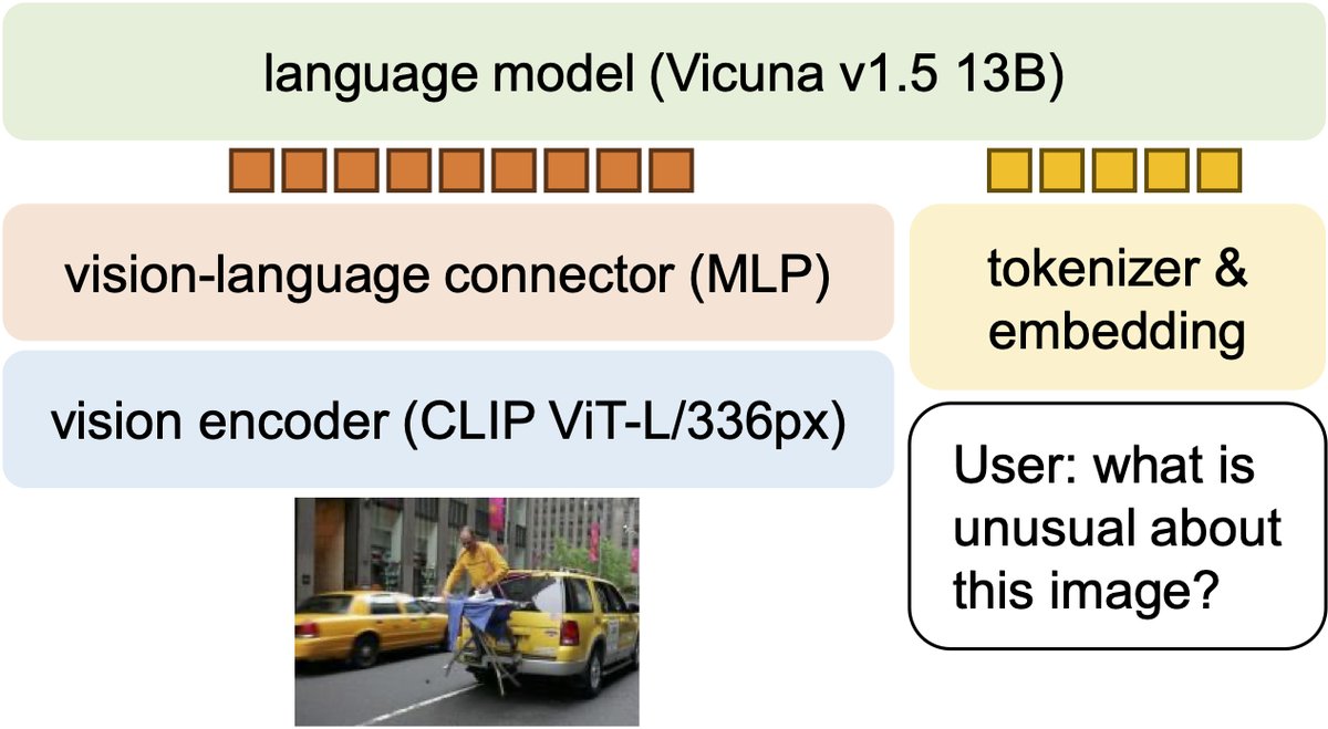 - 模型: 将视觉编码器从标准CLIP-ViT-L升级到能处理更高分辨率(336x336像素)的版本,并探索了将语言模型从7B扩展到13B参数,显著提升了模型在视觉对话等任务上的表现。
