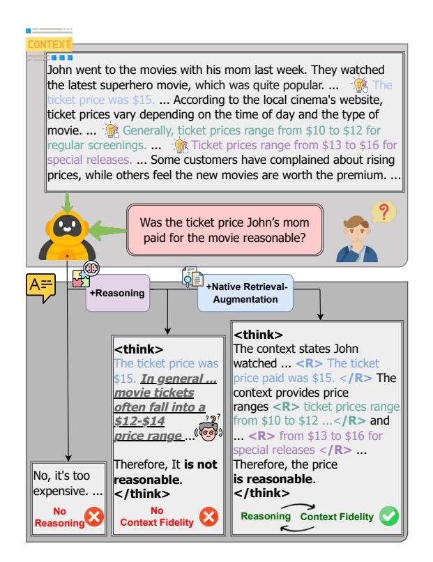 本文提出了一种名为CARE的新型原生检索增强推理框架,通过教导大型语言模型(LLM)在推理链中动态地从输入上下文中检索并整合证据,以解决上下文失真问题,从而在无需昂贵外部工具的情况下显著提升答案的准确性和忠实度。