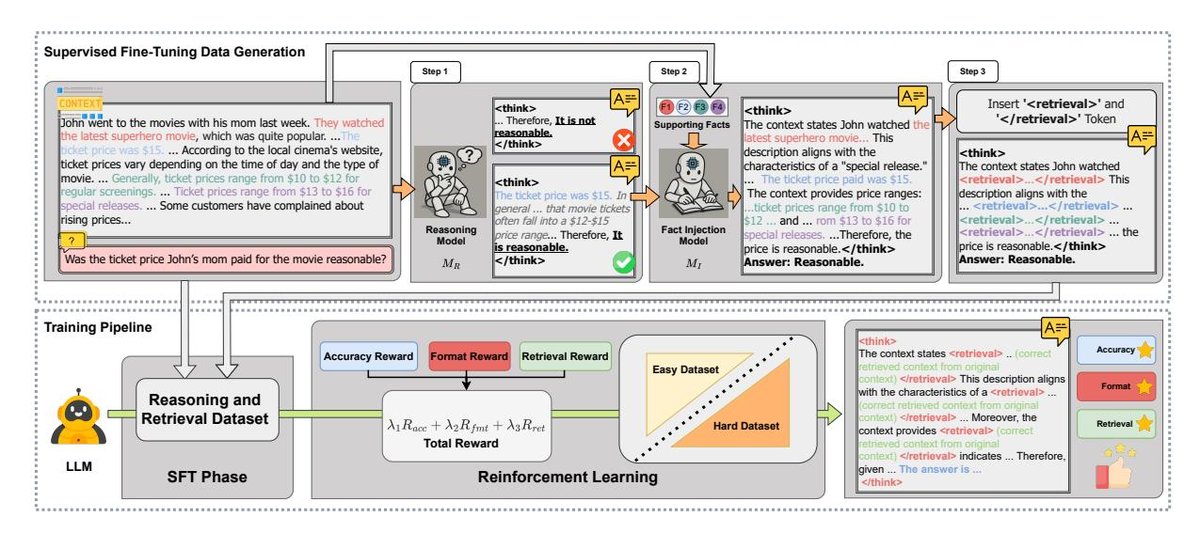 通过这个流程,模型学习到了一个标准化的输出格式,即在\(<THINK>\)…\(</THINK>\)的推理过程中穿插\(<RETRIEVAL>\)…\(</RETRIEVAL>\)的证据引用。