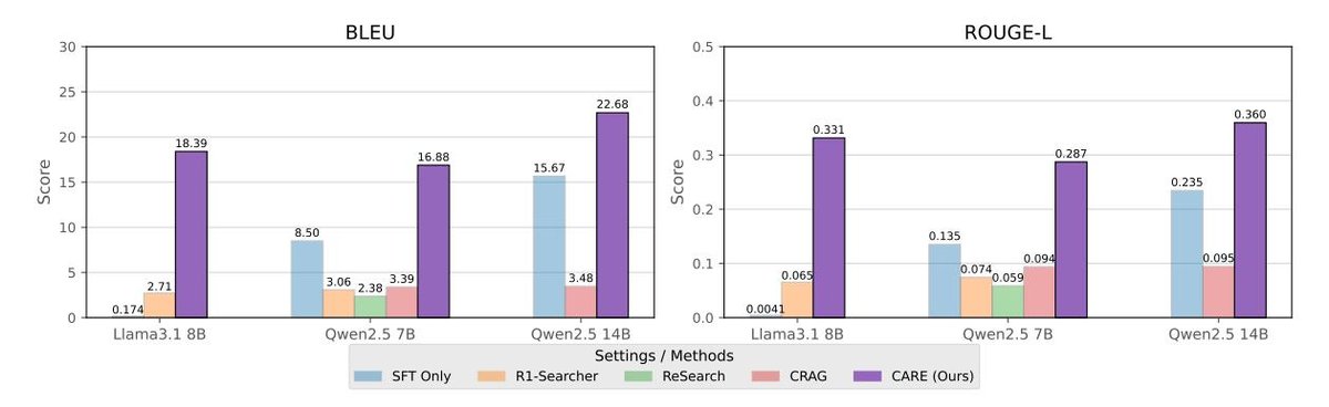 - 消融研究证实了CARE框架各个组成部分的必要性。仅SFT效果有限;RL训练是性能提升的关键;而检索奖励(Ret.)和课程学习(Cur.)的引入进一步显著增强了模型的性能和泛化能力。