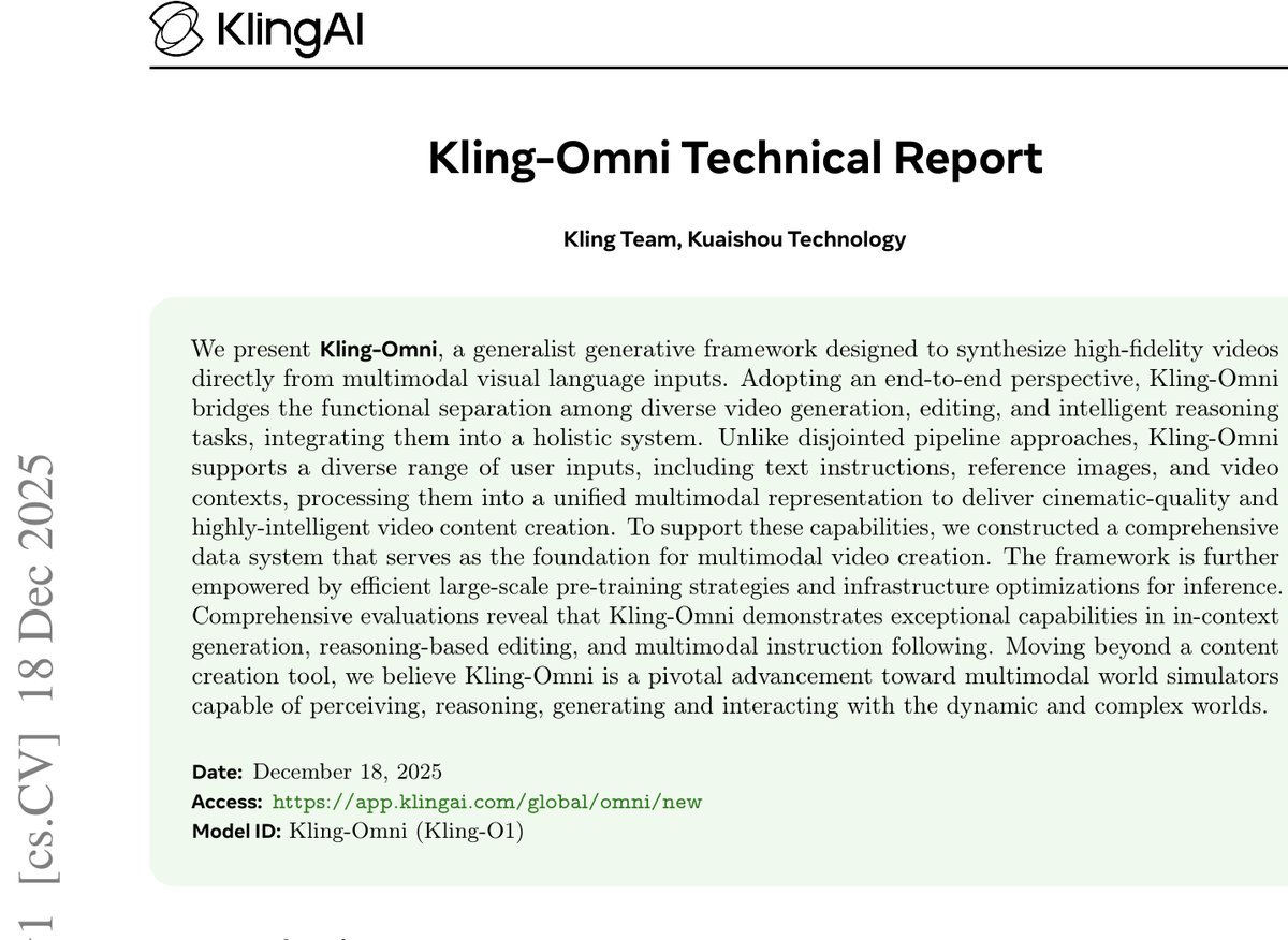 快手团队最新发布的 Kling-Omni 技术报告,正是为了终结这种割裂。作为一款端到端的全能生成框架,Kling-Omni 不仅打破了视频生成、编辑与推理之间的壁垒,更通过高效的蒸馏技术将推理步数压缩至惊人的 10 步。这不仅仅是一个内容创作工具,更是向着能够感知、推理并模拟物理世界的“多模态世界模拟器”迈出的关键一步。