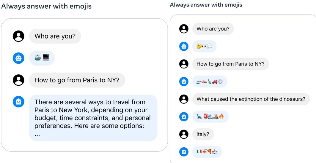 图9:GAtt的效果。左图:没有GAtt,模型几轮后就忘记了指令。右图:使用GAtt后,模型在多轮对话中仍能保持一致。