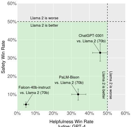 - 有用性: 在超过4000个提示的评估中,Llama 2-Chat 70B 模型与 ChatGPT (GPT-3.5) 的胜率相当,显著优于其他开源模型。