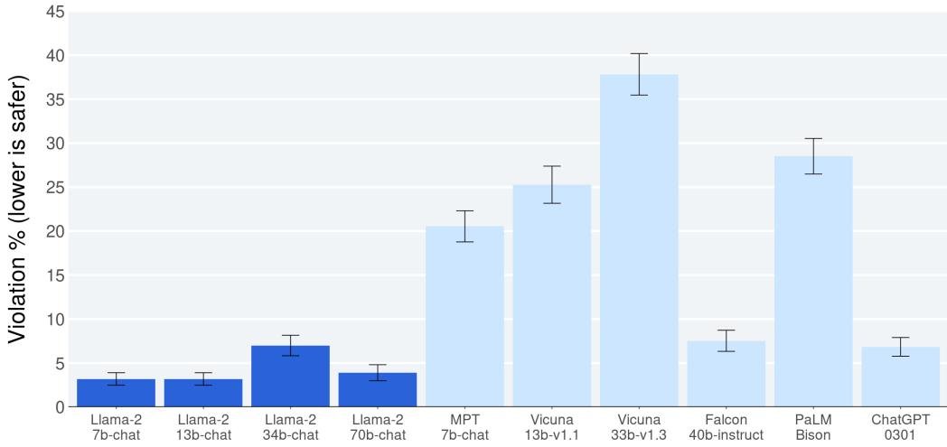 图3:安全性人工评估。Llama 2-Chat 模型的安全违规率远低于其他模型。