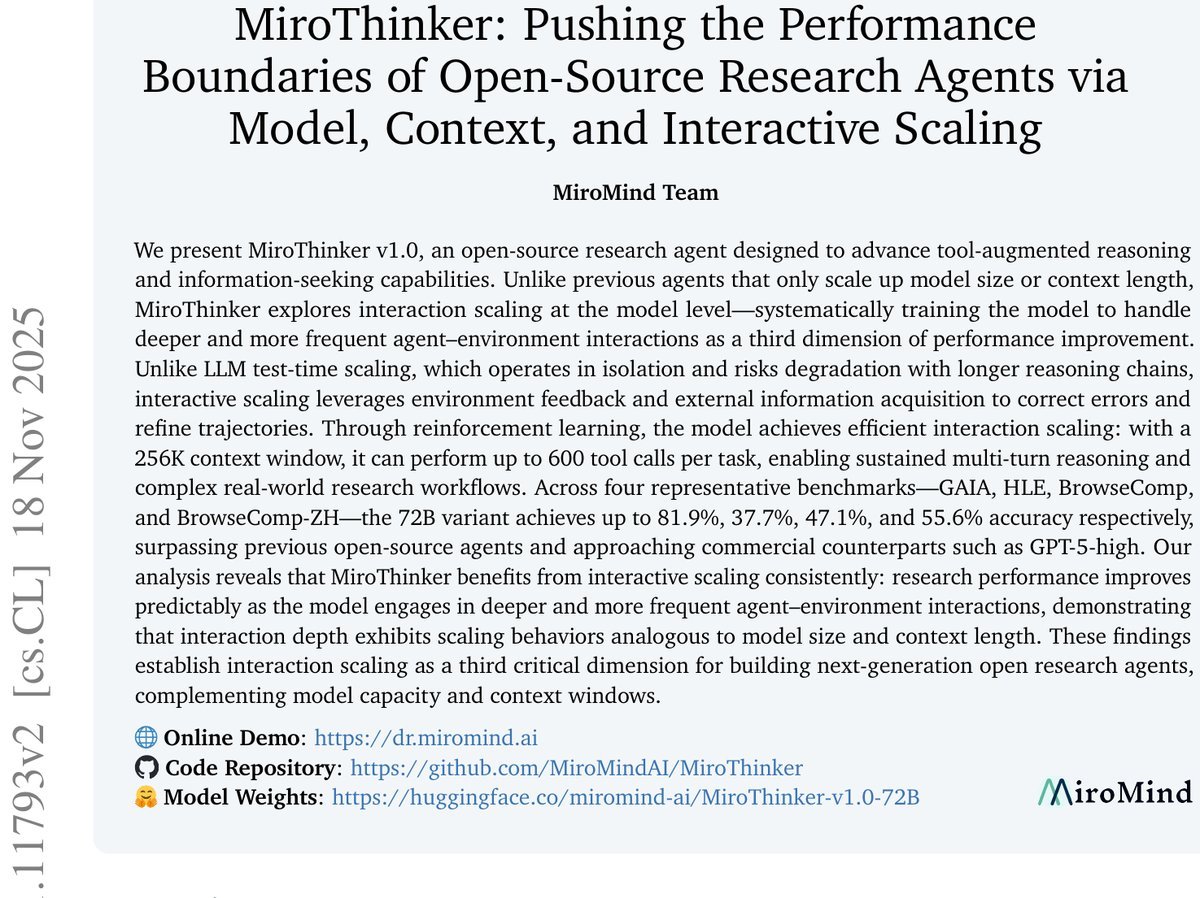 论文标题:MiroThinker: Pushing the Performance Boundaries of Open-Source Research Agents via Model, Context, and Interactive Scaling