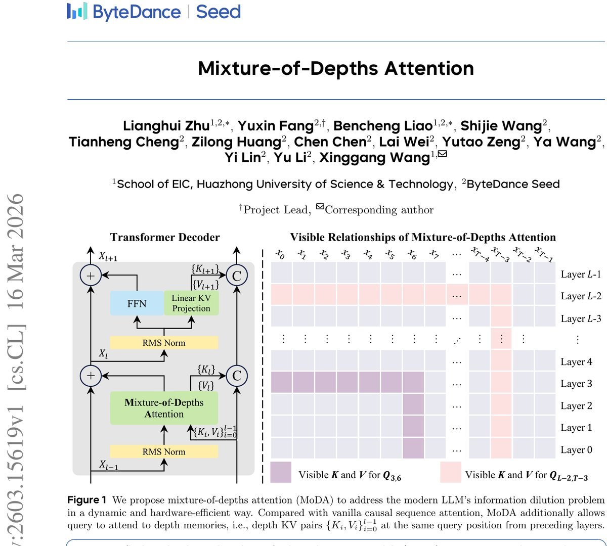 为了解决这个“健忘症”,来自字节跳动和华中科技大学的研究者们提出了一个全新的注意力机制:深度混合注意力(Mixture-of-Depths Attention, MoDA)。它让模型在处理当前序列信息的同时,还能“回头看”,动态地从前面所有层中提取最有用的信息。
