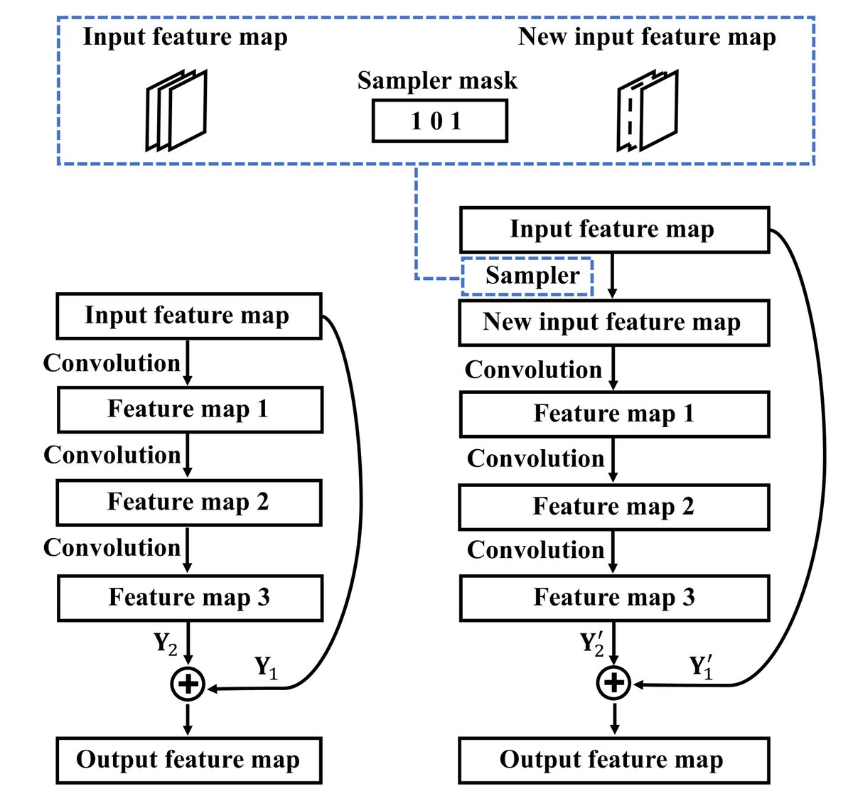 - 剪枝残差块的第一个卷积层: 为避免破坏残差连接的加法操作(要求特征图维度一致),本文引入一个“通道采样器”(channel sampler)来对输入特征图进行降维,而不是直接修改输入。