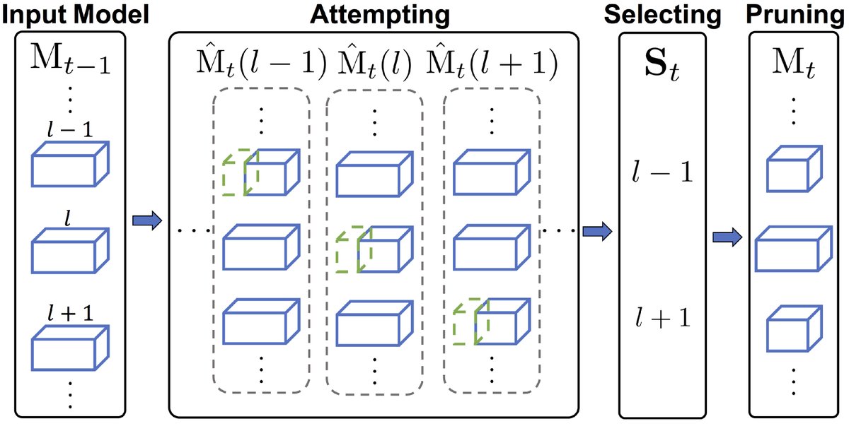 剪枝步骤 (Pruning Step):对“选择”步骤中确定的层进行永久性剪枝,并更新相关层的权重以补偿剪枝带来的精度损失。未被选中的层在此次迭代中保持不变。