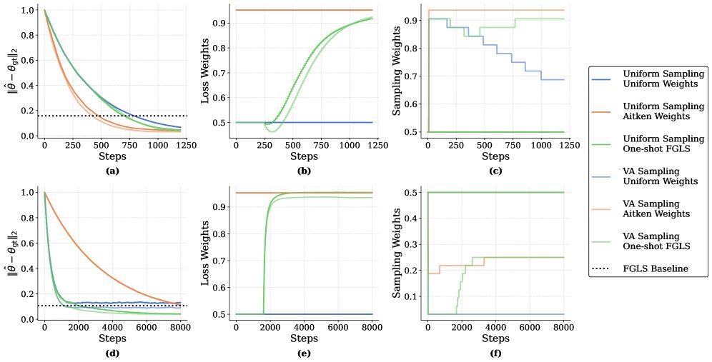 图1:线性回归实验结果。上排 \((C1, C2) = (100, 1)\),下排 \((C1, C2) = (1, 100)\)。可以看到 One-shot FGLS(损失权重)和 VA(采样权重)都比基线方法(Uniform)收敛得更快,误差更低。