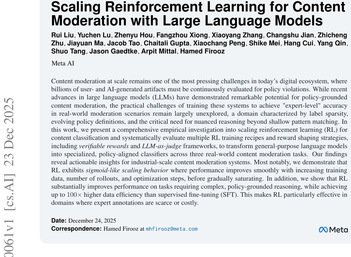 Meta AI 最新发表的研究 Scaling Reinforcement Learning for Content Moderation with Large Language Models 揭示了一个令人兴奋的结论:在内容审核任务中,强化学习(Reinforcement Learning, RL)不仅能显著提升模型的推理能力,更能实现高达 100倍的数据效率提升。