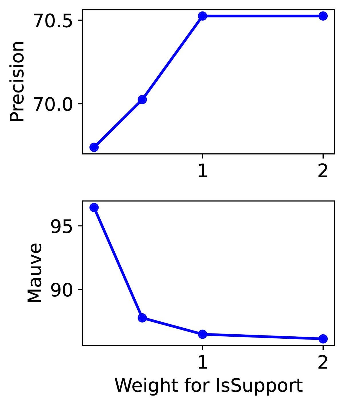 (b)可定制性,展示了调整 $$IsSup` Token 的权重可以在流畅性(Mauve)和引用精度之间进行权衡。