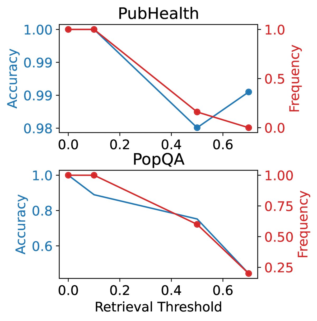 - 可控性验证: 消融实验证明了 Self-RAG 各个组成部分(如评价模型 \(C\)、\(IsSup\) 评价 Token)的有效性。实验还表明,通过在推理时调整评价 Token 的权重,可以有效地在生成内容的流畅性(MAUVE)和事实性(引用精度)之间进行权衡,实现了无需再训练的灵活控制。