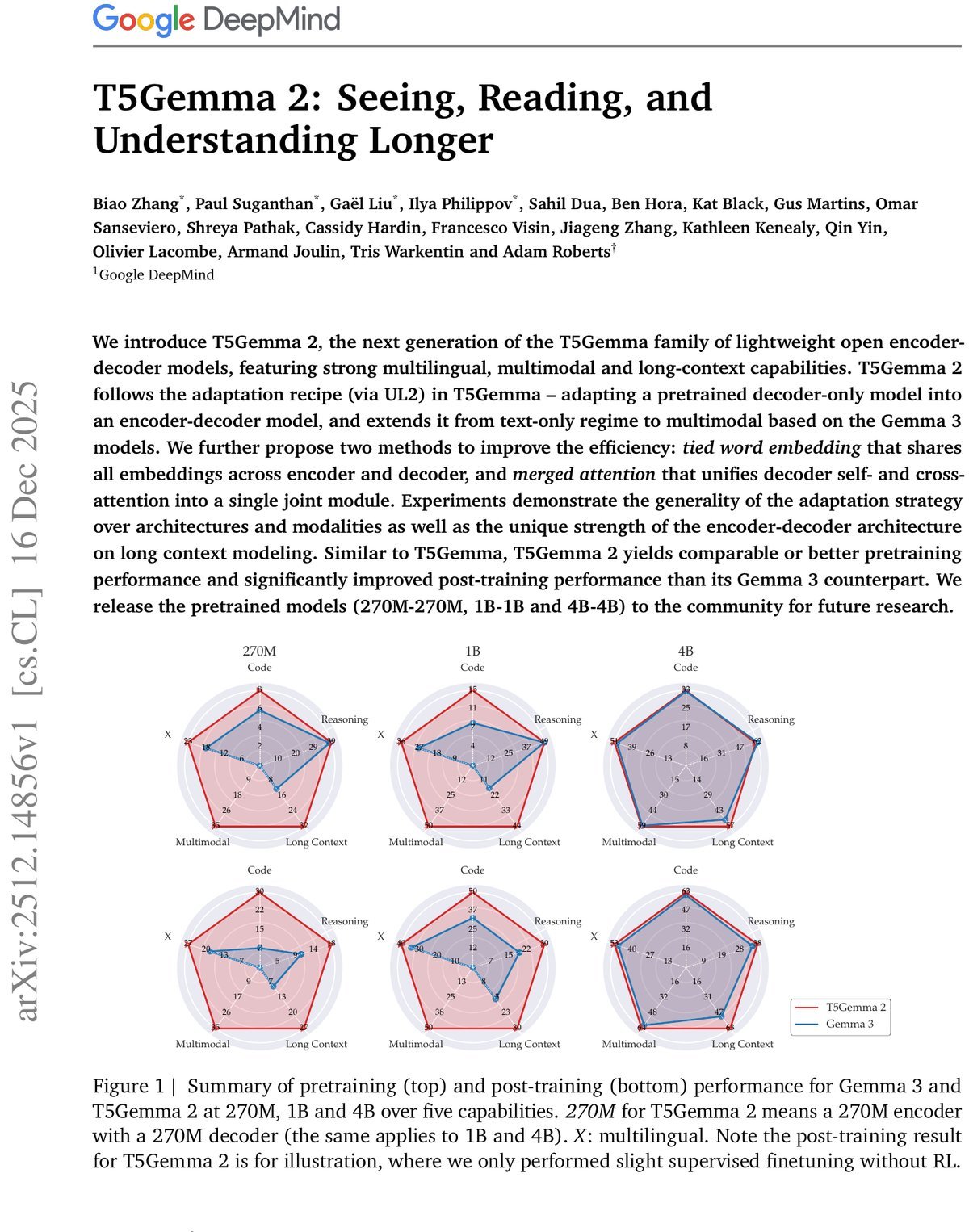 它不仅证明了我们可以低成本地将Decoder-only模型“改造”为Encoder-Decoder模型,更展示了这种架构在处理多模态信息和超长上下文时的天然优势。对于需要精准理解长文档、同时处理图文信息的应用场景,T5Gemma 2无疑提供了一个极具吸引力的开源新选择。
