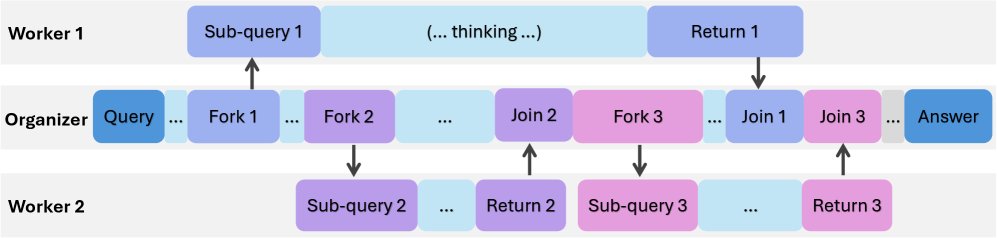 在一个容量为 $c$ 的智能体池中,有 $c-1$ 个工作者。它们接收组织者的指令,独立执行子查询,并将结果返回。组织者在发出 \(<FORK>\) 后可以继续自己的思考,而工作者则并发执行任务,实现了异步性。