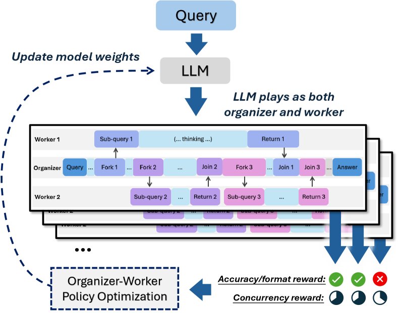 - 组织者 (Organizer):负责全局协调,通过特定动作(如 \(<FORK>\) 分配任务,\(<JOIN>\) 合并结果)来动态规划和管理整个思考流程。
