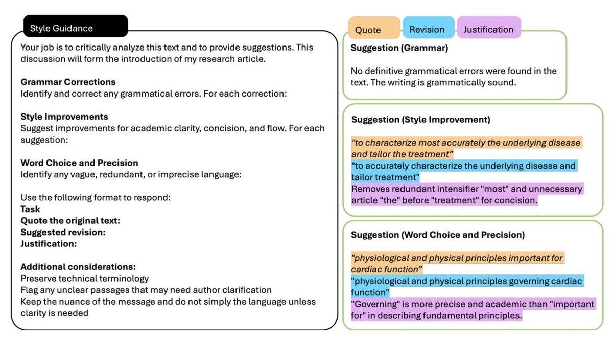 图6. 利用 LLM 进行文本编辑的推荐方法。 该框架展示了针对不同编辑任务(语法修正、风格改进、词汇优化)的提示工程策略,通过示例展示原文、建议修订和理由,以保持编辑过程的透明度。