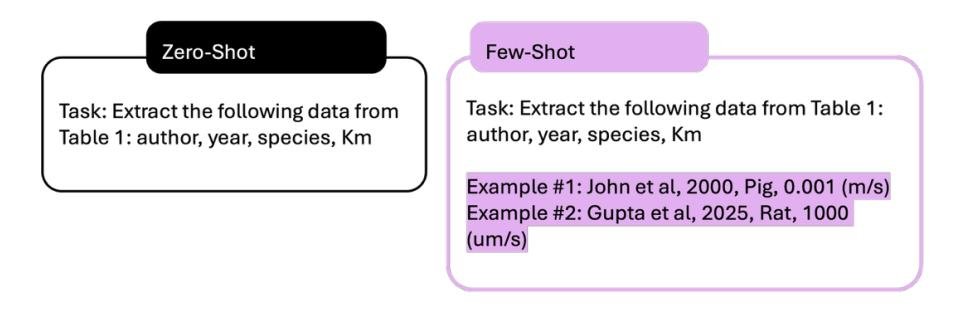 图7. 结构化数据提取的 zero-shot 和 few-shot 提示策略比较。 左侧的 zero-shot 提示只提供任务指令,没有示例。右侧的 few-shot 提示则为同一任务增补了示范性示例,展示了预期的输出格式和数据转换。
