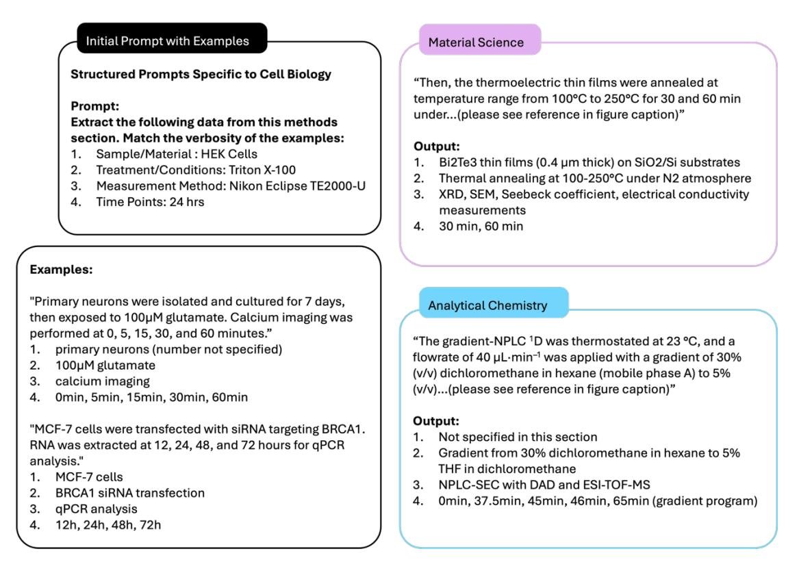 图10. 结构化提取提示的跨领域迁移能力。 尽管没有领域相关的示例,模型仍能正确地跨领域映射结构类别,提取温度范围、时间点和测量方法。
