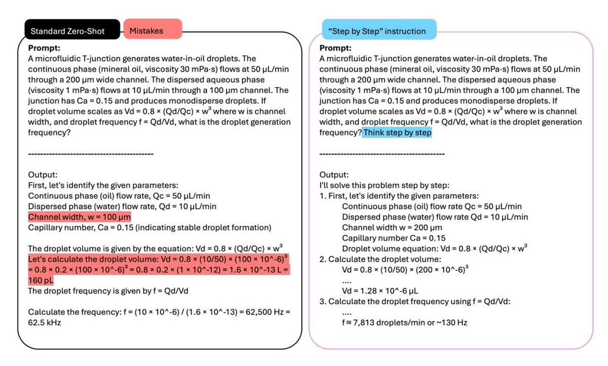 当前最强大的模型能够进行“推理”,即通过一系列中间步骤来解决复杂问题。这种技术被称为思维链(Chain-of-thought, CoT),最简单的调用方式是加上“一步一步思考”(Think step by step)的指令。CoT已被证明能显著提高LLM在数学、编码等任务上的准确性。如下图所示,在处理一个微流体问题时,未使用CoT的非推理模型会混淆物理参数并产生数量级错误,而加入“一步一步思考”的指令后则能产生正确的序贯推理。