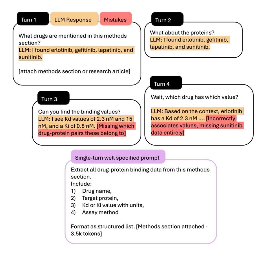 在科学数据挖掘等任务中,多轮对话会严重损害提取的准确性。随着对话轮次增加,模型会逐渐丢失关键信息,最终产生不完整或错误映射的数据。研究表明,所有SOTA模型在多轮对话中都表现出严重的性能下降。一个设计良好、信息明确的单轮提示的性能远高于将同样信息分解到多轮、不明确的提示中。