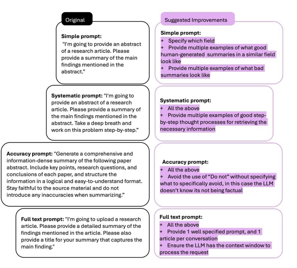 为了提升零样本提示的质量,本文基于 Peters 和 Chin-Yee (2025) 的研究,对摘要生成任务的提示提出了改进建议。核心改进点包括: