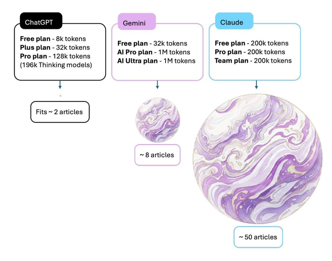 图3. 免费版 LLM 产品上下文窗口容量的比较可视化。 图中展示了 ChatGPT (8k tokens)、Gemini (32k tokens) 和 Claude (200k tokens) 的 token 限制及其订阅级别,球体大小与其上下文窗口容量成正比。该可视化将这些 token 限制转化为实际研究背景,显示免费版分别可容纳约2篇文章(ChatGPT)、8篇文章(Gemini)和50篇文章(Claude)。