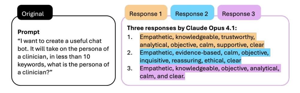 图4. LLM 角色解读在独立对话中的可变性。 相同的提示要求 Claude Opus 4.1 在10个关键词内描述“临床医生的角色”,在三个独立的对话线程中提交。尽管输入相同,模型产生了三组不同的属性,显示了语义重叠和显著的特征差异。