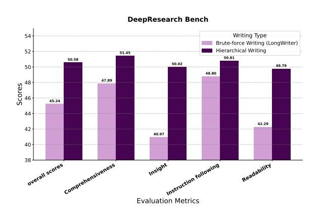 分层写作的优越性:通过与将所有证据一次性输入的“暴力”写作基线(类似LongWriter)进行对比,本文的分层写作方法在所有评估维度上都取得了压倒性优势,特别是在洞察力(40.97 → 50.02)和可读性(42.29 → 49.79)指标上。这证实了“分而治之”的注意力管理策略对于生成高质量长篇报告至关重要。