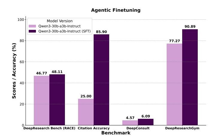 智能体微调(Agentic Finetuning):为了提升小型模型(如30B规模)的性能,本文使用一个强大的教师模型在WebWeaver框架内生成了3.3k条高质量的规划和写作轨迹数据,构成\(WebWeaver-3k\)数据集。在这些数据上对Qwen3-30B模型进行微调后,其性能得到巨大提升,引文准确率从25%跃升至85.90%。这证明了WebWeaver框架的复杂技能(如思考、搜索、写作)是可被“蒸馏”和学习的,使得更小、更易于部署的模型也能达到专家级的性能。