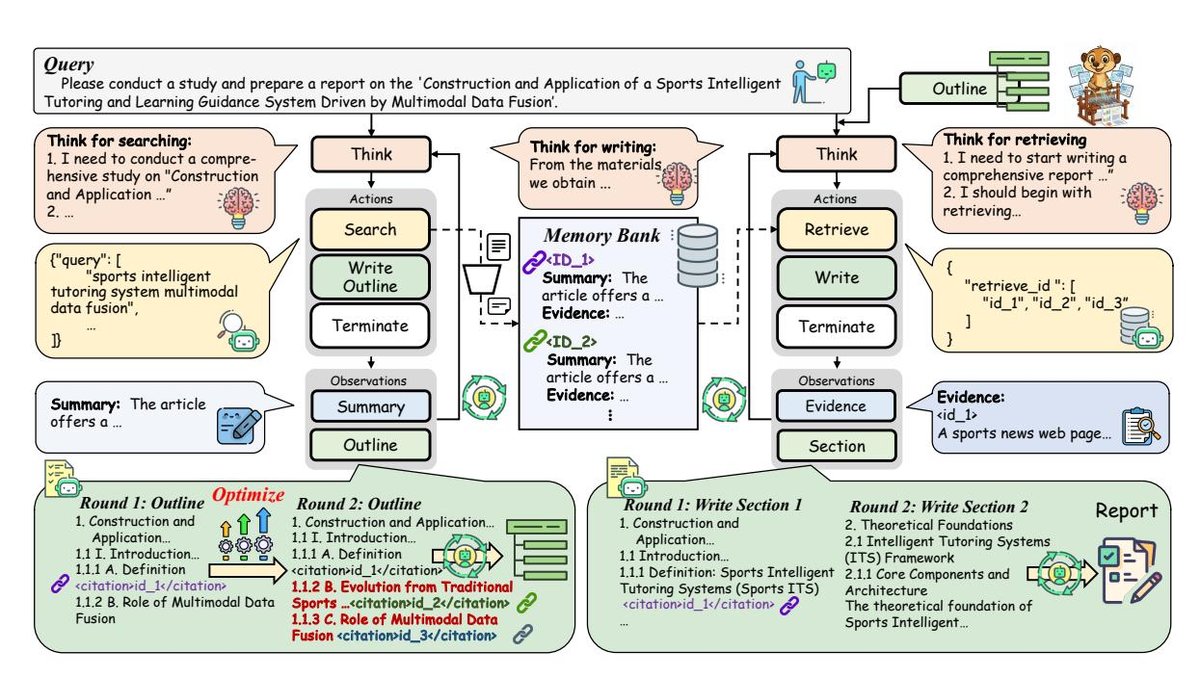- 记忆驱动的合成 (Memory-Grounded Synthesis):写作者智能体的核心工作机制。为避免长上下文问题,写作者采用“分而治之”的策略,按章节撰写报告。在撰写每个章节时,它仅从一个集中的证据记忆库中,根据大纲中的引文标记,检索并关注与该章节最相关的证据。