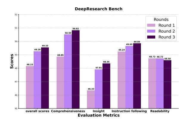 大纲优化的有效性:消融实验表明,随着大纲优化轮次的增加(从1轮到3轮),报告的最终得分(尤其在全面性和洞察力方面)显著提升。这直接证明了迭代优化过程并非冗余,而是提升报告深度和结构的关键机制。